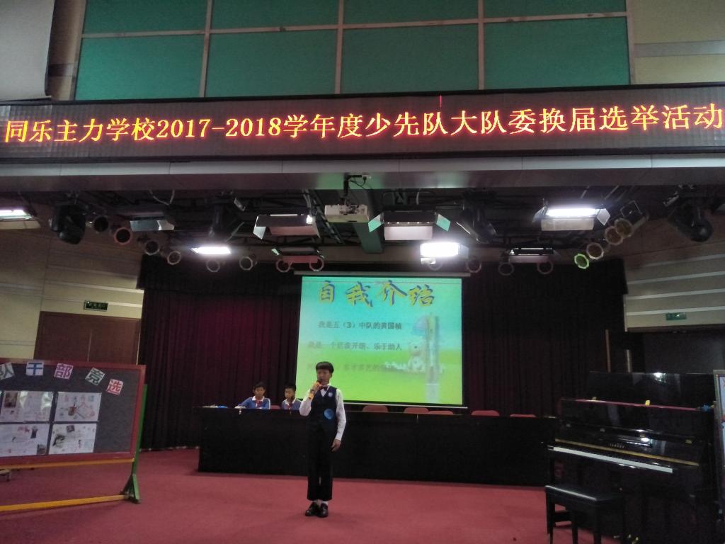 为了提高少先队组织的整体素质,增强队员们的竞争意识,为队员们创造充分展示聪明才干的机会,同乐主力学校少先队大队部于10月20日下午举行了新一届少先队大队委竞选活动。