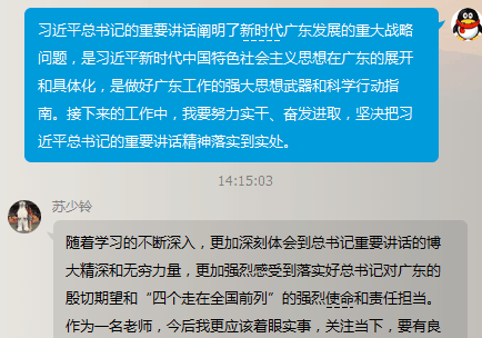 学习会上,党支部书记、校长郭庆文同志带头谈学习体会。郭书记认为,习近平总书记去年对广东工作作出“四个坚持、三个支撑、两个走在前列”的重要批示,今年全国“两会”期间,又亲临广东代表团参加审议,充分体现了习近平总书记对广东人民的亲切关怀,对广东工作的高度重视和殷切期望。我们要将深入学习宣传贯彻习近平总书记广东团重要讲话精神,作为学校当前和今后一个时期的重要政治任务。广大党员教师一定要牢固树立“四个意识”、坚定“四个自信”,深刻领会总书记对广东的关心关怀,把学习贯彻总书记广东团重要讲话精神与学习贯彻习近平新时代中国特色社会主义思想和党的十九大精神紧密结合起来、与学习贯彻习总书记对广东工作作出的重要指示批示精神紧密结合起来,坚定自觉地在思想上、政治上、行动上同以习近平同志为核心的党中央保持高度一致,推动习近平新时代中国特色社会主义思想在我校落地生根、结出丰硕成果。