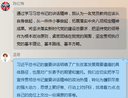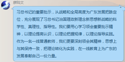 学习会的最后,党员们围绕总书记的重要讲话展开讨论,现场气氛活跃热烈。大家一致表示,总书记的重要讲话饱含对广东的深情厚爱和殷殷重托,为广东改革发展指明了前进方向、提供了根本遵循、注入了强大动力。我们要以走在前列的使命和担当,推动思想再解放、改革再深化、工作再抓实,要以高度的思想自觉和行动自觉认真学习贯彻习近平总书记重要讲话精神,以扎扎实实的工作成效回报习近平总书记的殷切期望。