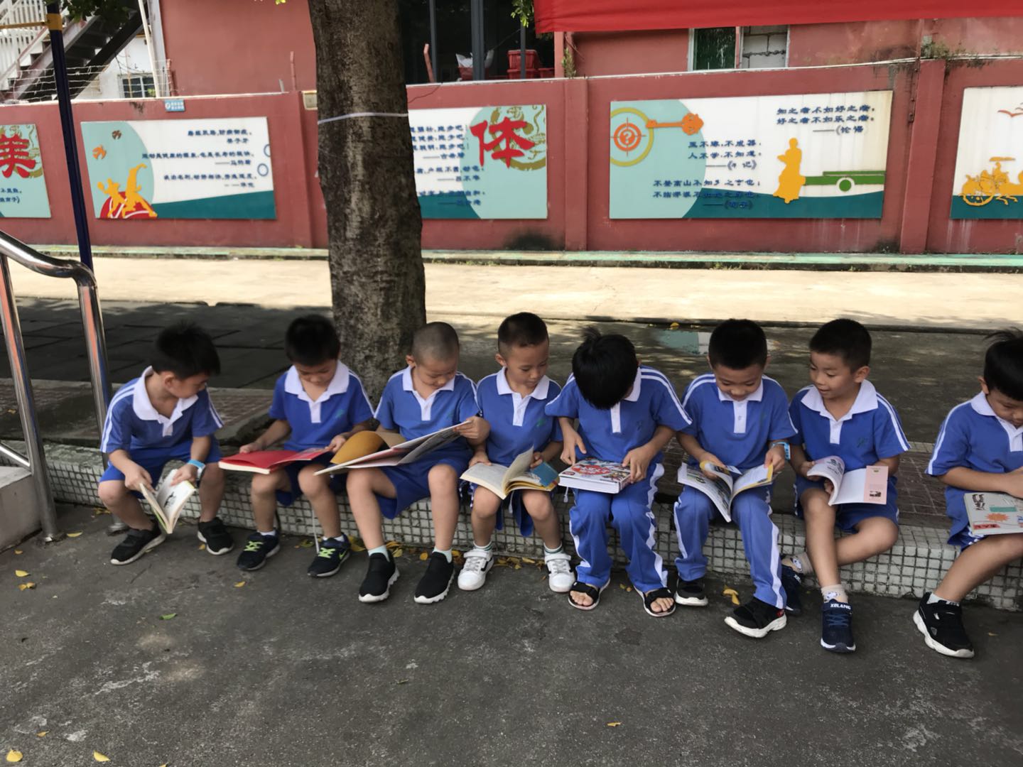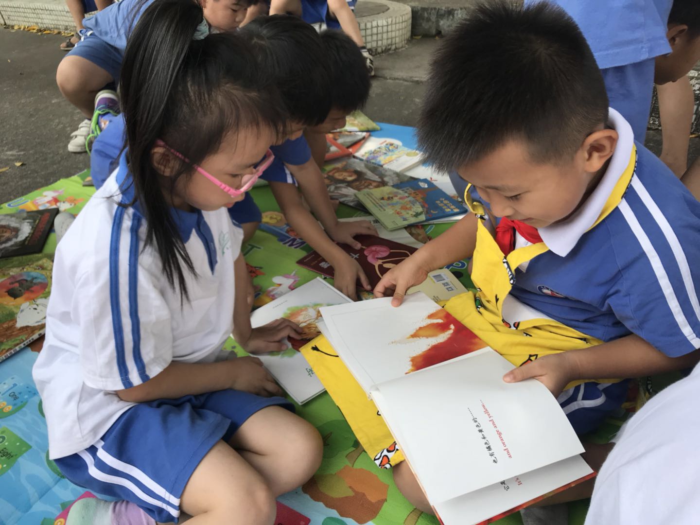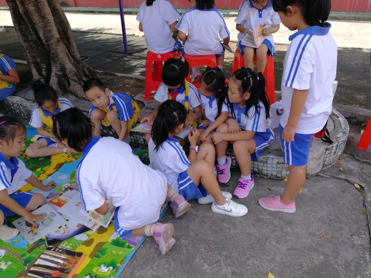 看看这排成一排的认真的小男生们,多像一群可爱的小天使啊!那沉浸其中的表情仿佛在说:“这本书实在是太有趣了!”有些一年级的小朋友因为刚进入学校,认识的字还不多。我们的“爱心小分队”的成员们便耐心地给他们讲书中的故事,给他们开启一个精彩的“书中世界”。