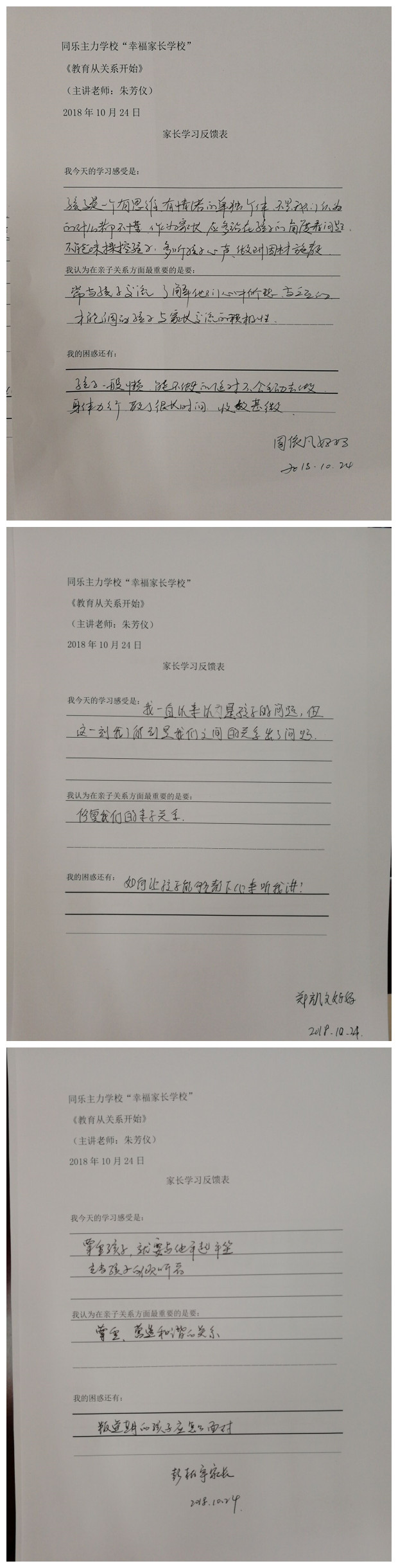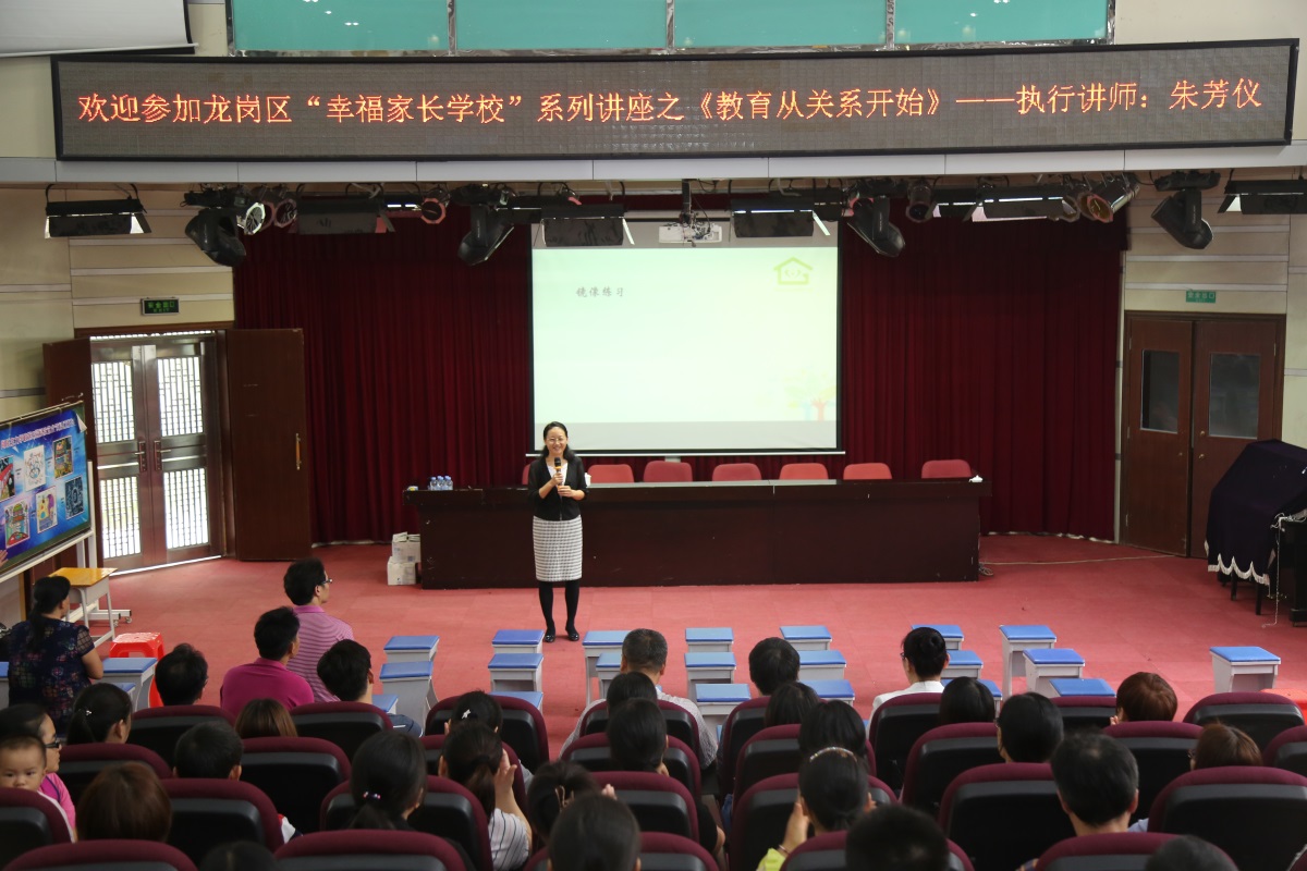 为了让家庭教育助力孩子健康成长,2018年10月24日,同乐主力学校特别邀请了深圳市首批家庭教育高级指导师、龙岗区家庭教育专业执行讲师团——朱芳仪讲师给我们开展“幸福家长学校”之系列课程——《教育从关系开始》。我校郭校长、德育处李建新主任、科研处邹火滚主任、教导处王丽副主任和七年级学生家长参加了此次讲座。