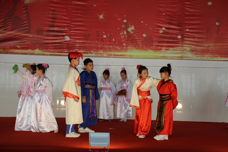 五年级的孩子们用她们那曼妙的舞姿,将积淀了古代文化的《书简舞》在舞台上展现出来,充分显示中华民族之魂。
