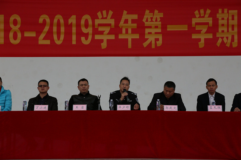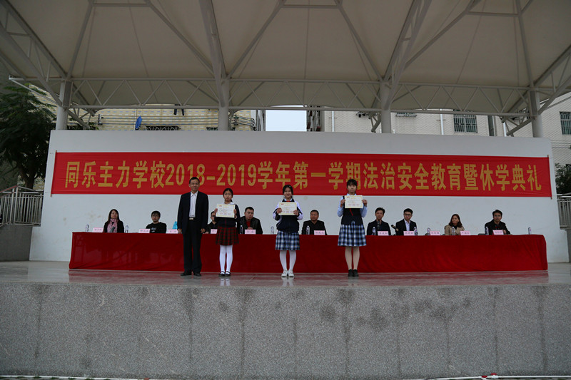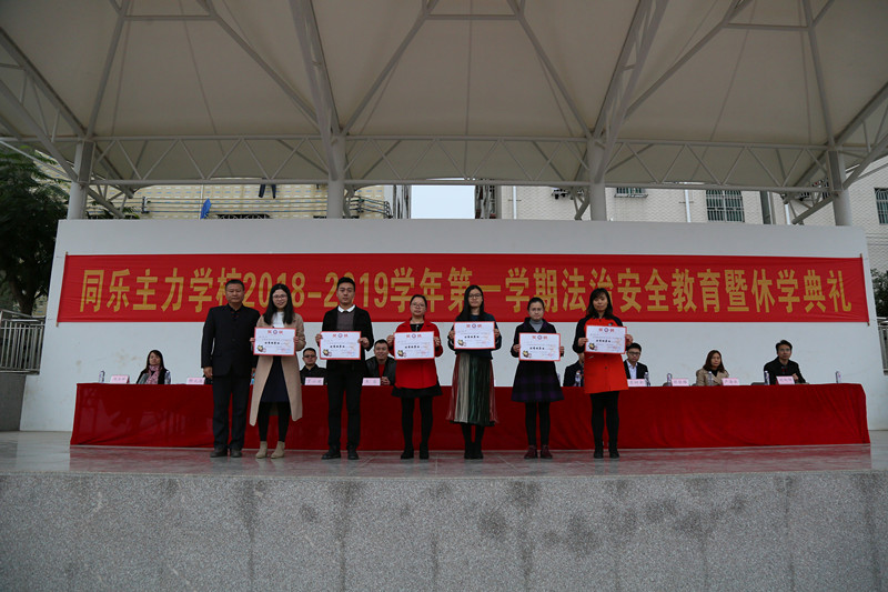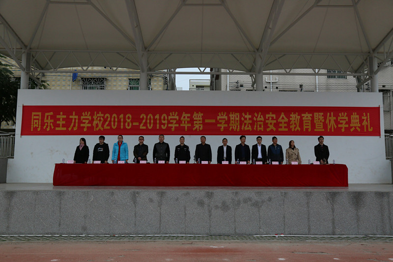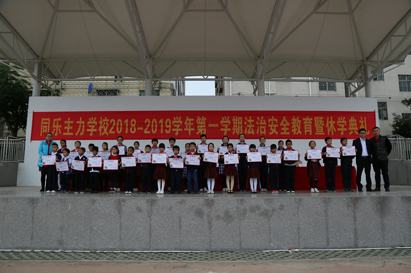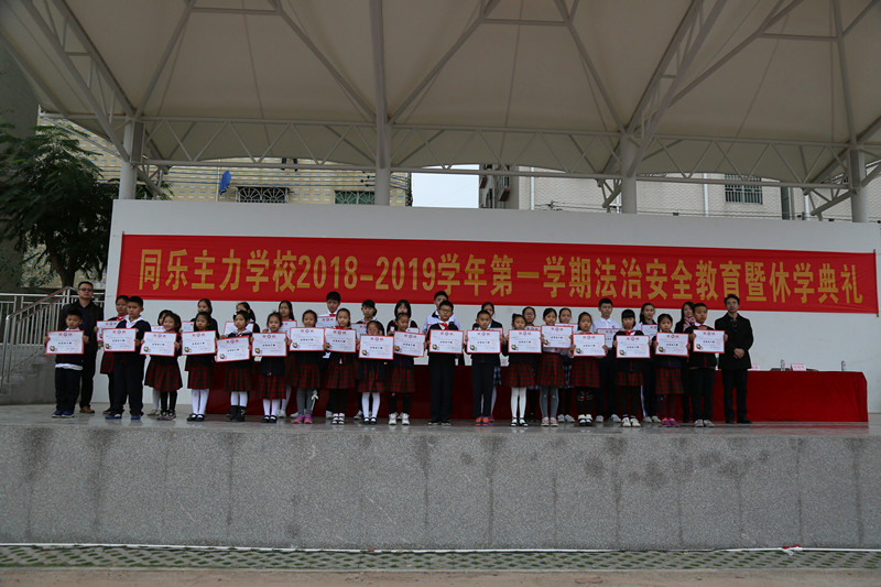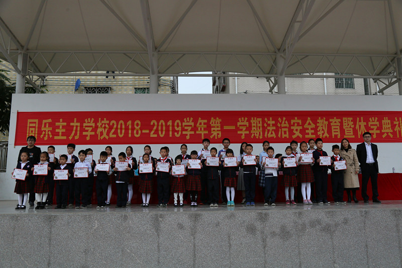 为表彰本学期各方面有突出表现和进步的学生,激发全体师生工作与学习的热情,倡导安全文明、绿色环保的寒假生活,1月18日下午,同乐主力学校2018——2019学年第一学期期末法制安全教育暨休学典礼在学校绿茵场举行。郭庆文校长、蓝天胜副校长等行政班子、龙岗区同乐派出所卓少彬警官、全体师生和部分家长义工代表齐聚现场。散学礼由德育处刘向阳副主任主持。