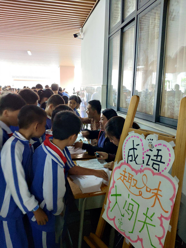 游园活动精彩纷呈,各摊位都准备了花样繁多的趣味游戏,让人应接不暇。活动项目包括你来比划我来猜、成语动物园、词语开花、错别字我来找茬、玩转古诗等,形式多样,丰富多彩。现场气氛非常热闹,学生们积极投入,认真思考、大胆猜想,将学习与玩乐相结合。