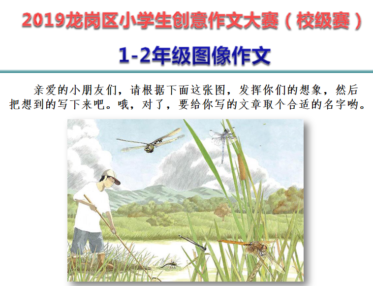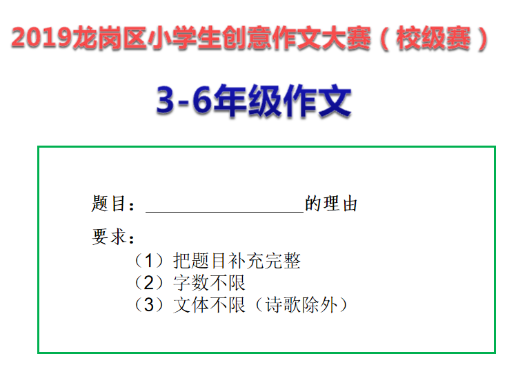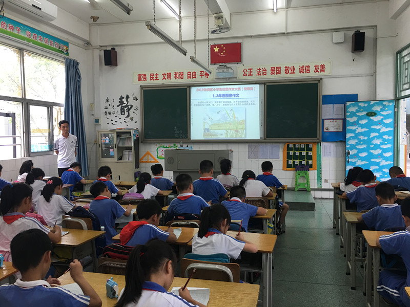这次创意作文比赛立足公平,公正,公开的原则,以龙岗区教研室统一命题,学生现场作文的形式开展。为了贯彻以生为本的素质教育观,此次比赛分两个年级段考题:针对一二年级学生的图像作文和三到六年级的半命题作文,充分给予不同个性的孩子广阔的想象空间,让他们在自己的想象中尽情起舞,展现自我个性风采。
