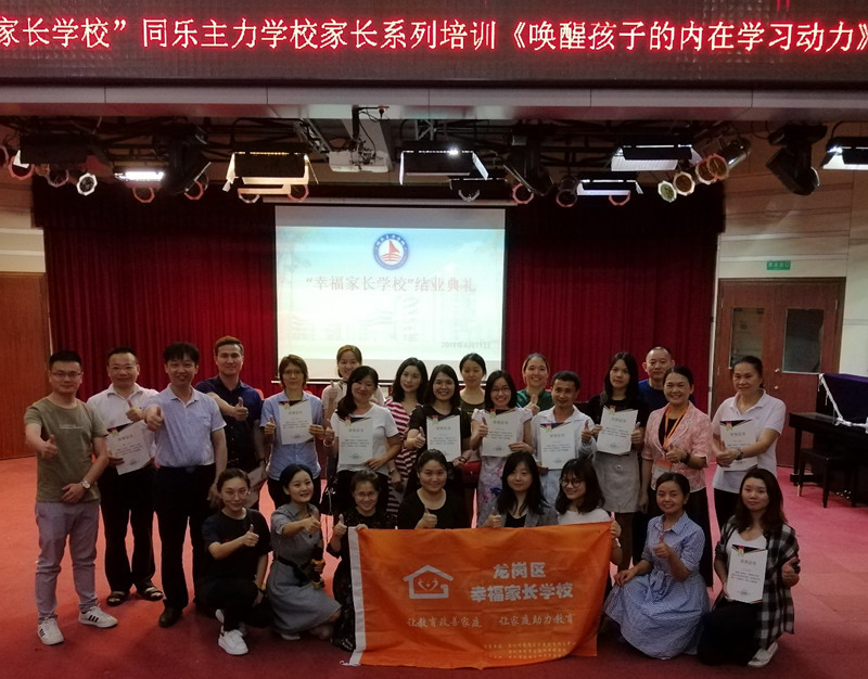 课程结束后,同乐主力学校德育处邀请曾老师一起为在本期幸福家长学校获得“幸福家长”称号的14位家长颁发荣誉证书,并合影留念。