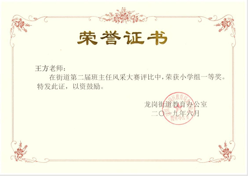 为了加强班主任队伍建设,提高班主任的专业水平和育人能力,龙岗、宝龙街道于2019年5月29日在新生小学举行第二届班主任风采大赛,同乐主力学校名班主任工作室主持人王方老师荣获小学组一等奖。