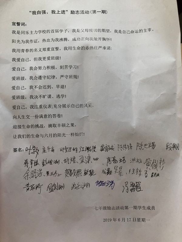 欲成才先成人。为了给学生传递正能量,帮助学生明确自己的人生方向和奋斗目标,激发学生锐意进取的积极性,同乐主力学校特举办“我自强,我上进”系列励志活动。6月17日,第一期活动在学校大会议室举办。郭庆文校长、德育处刘副主任、七年级全体班主任及各班学生代表参加此次大会,会议由团委余挺老师主持。