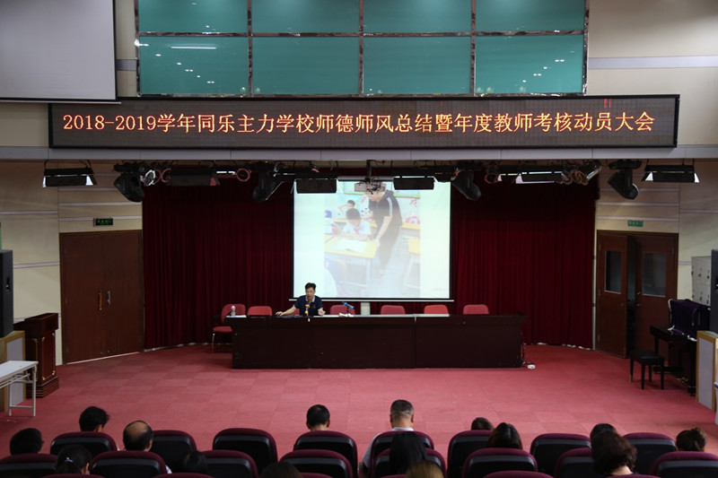 为进一步加强师德师风建设,规范教师从教行为,努力提高教师的思想政治觉悟和职业道德水平,6月26日下午,同乐主力学校召开师德师风总结暨年度教师考核动员大会,全体教职工参与此次会议。大会由教导处王岩主任主持。