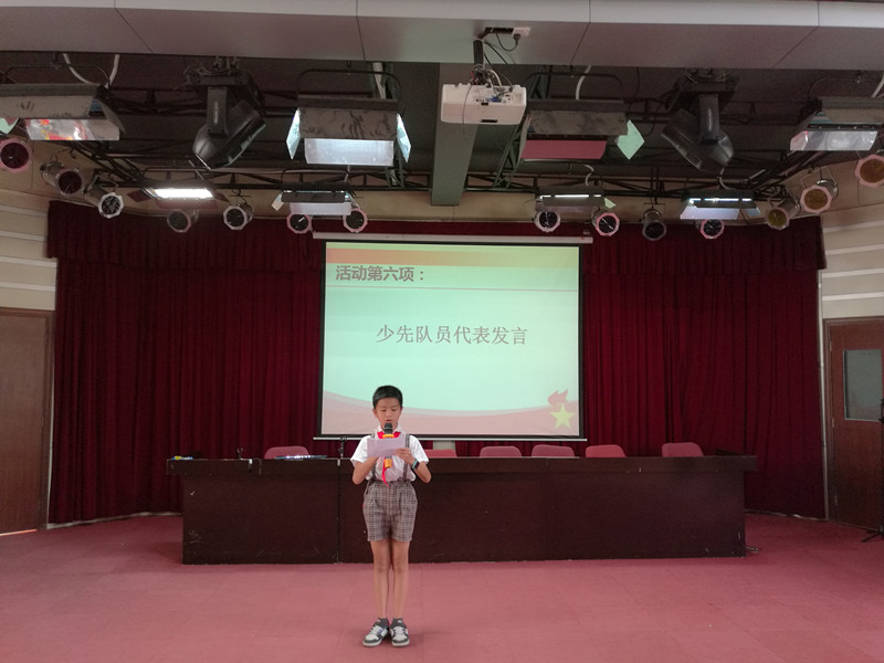 随后,来自五(4)班的黄立可同学作为队员代表讲话。他告诉队员们,领巾大,责任大,大号红领巾代表了爱国守法,明礼诚信,团结友善,勤俭自强,我们要努力使自己成为一个能无愧于胸前的红领巾的好少年。