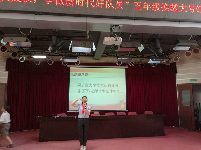 最后,五年级换戴大号红领巾主题活动在全体少先队员的庄严呼号声中圆满结束了。