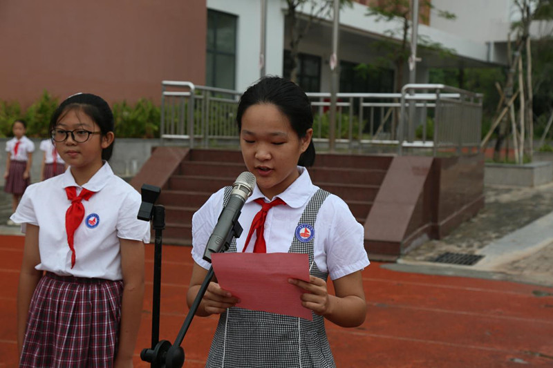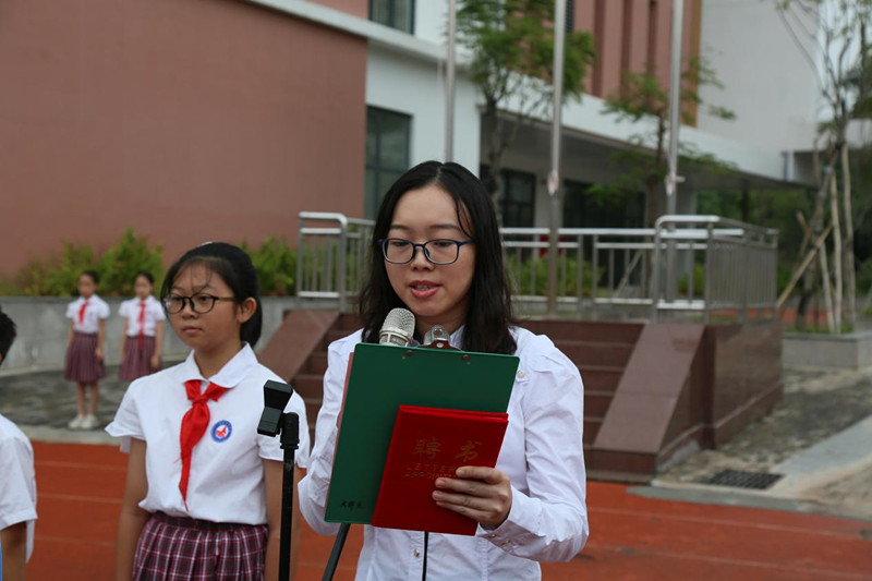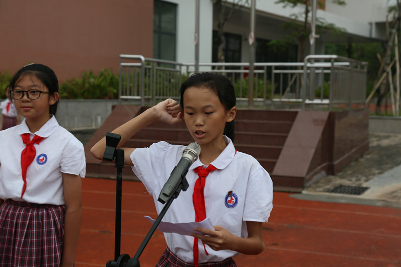 七年级队员代表俞丽诗代表全体队员发言。她郑重承诺,在未来的学习和生活中会更加严格要求自己,遵守校纪校规,与同学团结协作,在各方面努力起到良好带头作用,并积极向共青团组织靠拢,争取早日成为这个光荣组织的一员。