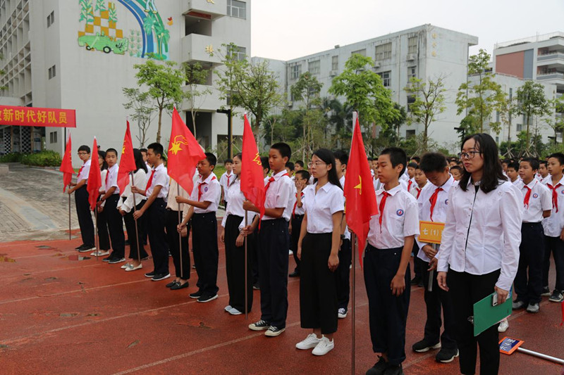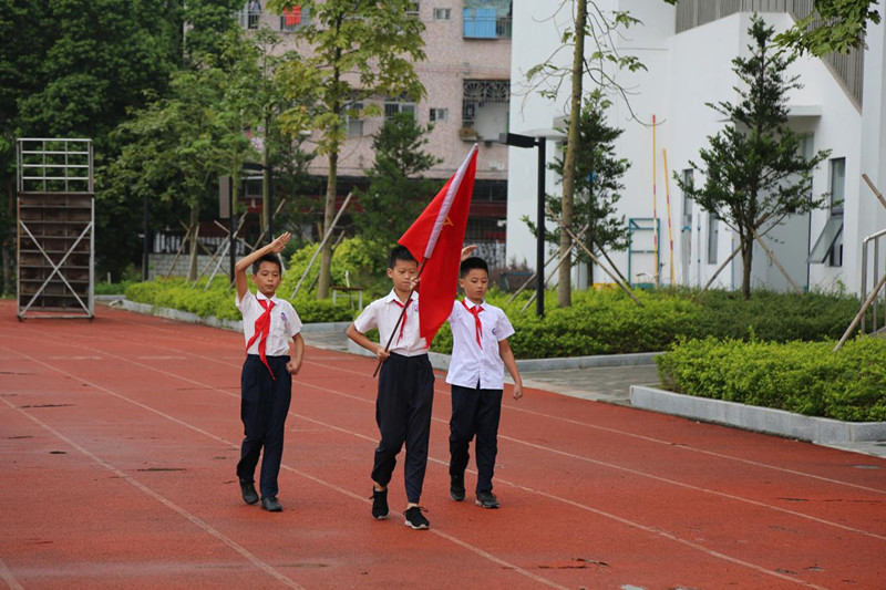 催人奋进的国歌声奏响,全体少先队员将右手高高举过头顶,注视着缓缓升起的国旗。随后,三名少先队员高擎中国少年先锋队队旗,迈着整齐的步伐走向各中队,全体少先队员面向队旗高唱中国少年先锋队队歌,嘹亮的歌声盘旋在校园的上空。
