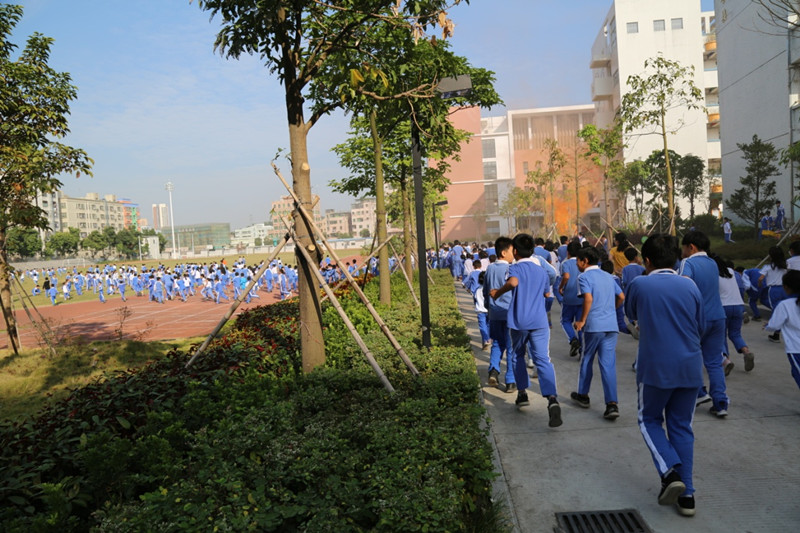 8点55分,警报声响,学校行政立即行动,让班主任、导师快速入班,组织学生用手帕、毛巾、衣服等捂住口鼻,弯着腰有序地按既定的逃生路线迅速离开危险场所到足球场。到达指定地点后,各班班主任迅速清点出班级疏散人数,并向指挥部报告疏散人数。