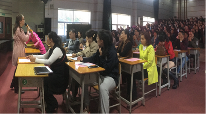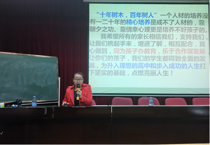 家长会上,中学部教导处王丽副主任首先发言。她立足五校联考的数据对本校的期中考试成绩进行了分析。她表示,经过学生们的刻苦学习和教师们的辛勤付出,本次期中考试的成绩对比第一次月考,取得了可喜的进步,与其他学校的平均分差距已不断地缩小,物理、生物等学科在联考中的都处于优势地位。王副主任还透过成绩看问题,她认为,学生在周末及假期中的学习效率、作业质量和学习态度等方面还需加强,需要家长关注与监督。最后,王丽副主任强调了英语听说口语在中考中的重要性,还对本周日将在学校进行的英语听说口语模拟考试进行了详细部署与安排。