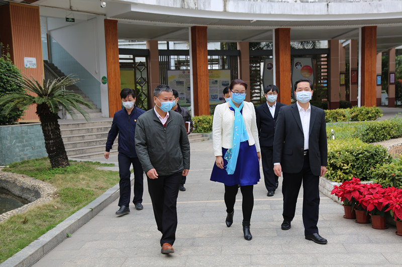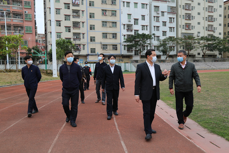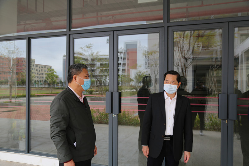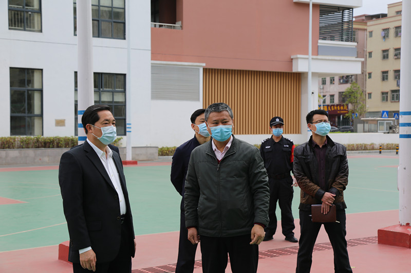 黄惠波副区长一行在郭校长的陪同下巡查校园,深入学校扩建后的中学部教学楼、教职工饭堂、体育馆等功能场室,了解学校日常教育教学情况。黄惠波副区长询问了学校疫情防控工作、师生摸底排查数据、防控物资储备、在线教学等工作进展情况。郭校长对学校疫情防控措施,湖北籍、温州籍教职工及学生情况,在线教学等工作进行了详细的汇报。黄惠波副区长对学校周密部署疫情防控和在线教学取得的良好效果表示肯定,并就今后学校疫情工作要求进行了强调。一是学校一定要做好安全工作,关注师生生命安全和身体健康。二是学校要多关心教职工和学生的生活和学习,让尚未返回深圳的广大师生安心。三是学校线上教学要根据区教育局的统一部署,创新学习方法,充分激发学生的学习兴趣,让学生快乐学习。郭校长表示学校一定会为师生营造一个健康、安全的校园环境,让全体教职工安心工作,让学生快乐学习。郭校长还表示全体师生对打赢这场疫情防控狙击战充满信心。最后,黄惠波副区长委托郭校长转达对学校全校师生的问候,祝福师生们身体健康,工作顺利,学习进步。