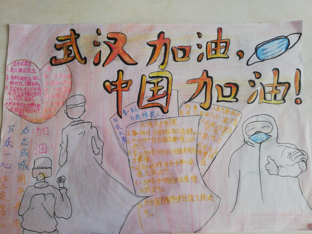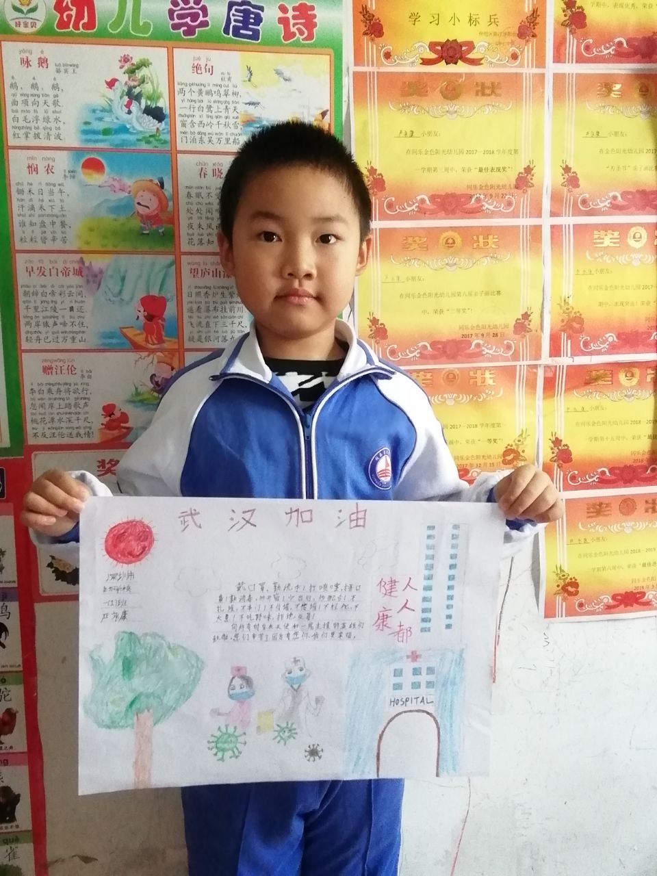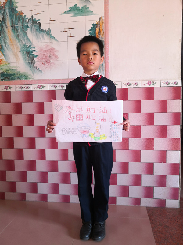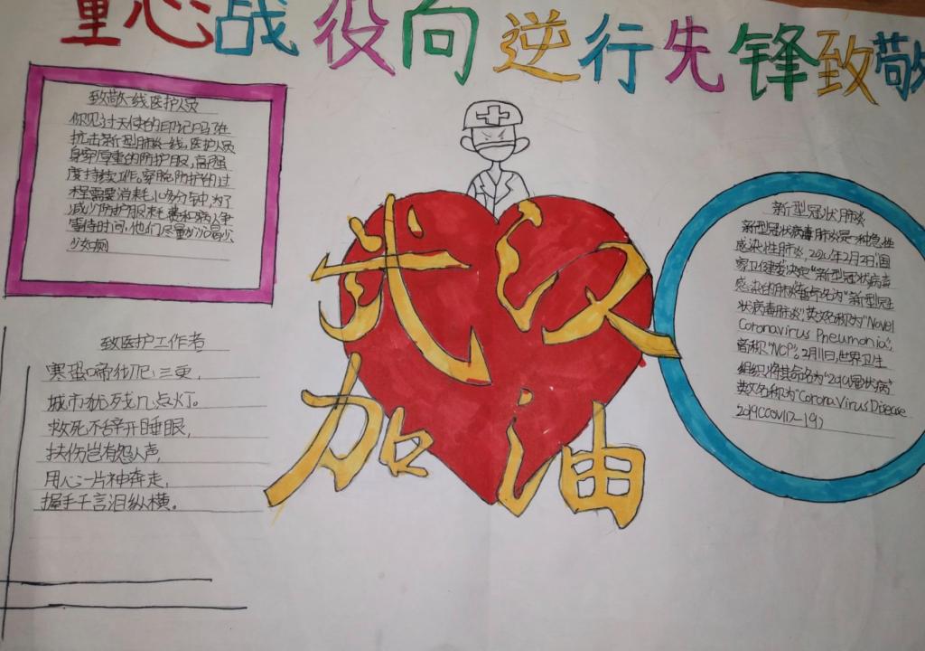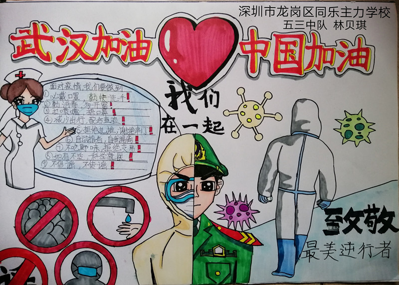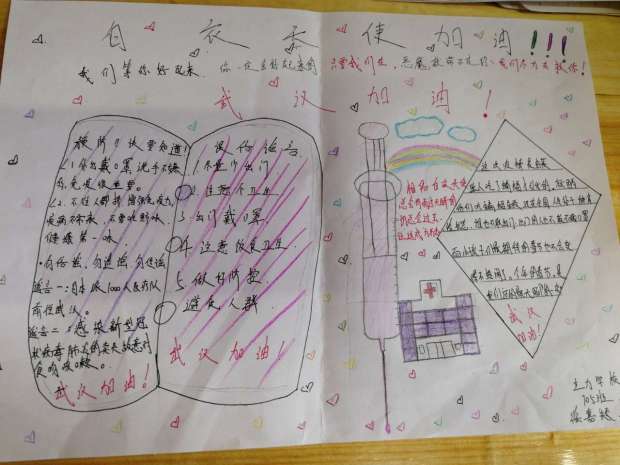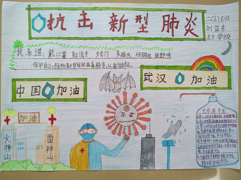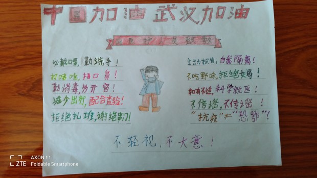 同乐主力学校二(6)中队的刘益东心怀感恩的心,挥动着手中的笔,把笔作为武器,通过制作小报,加入这场防疫战中,为大家宣传疫情防控知识,为武汉加油,为中国加油!