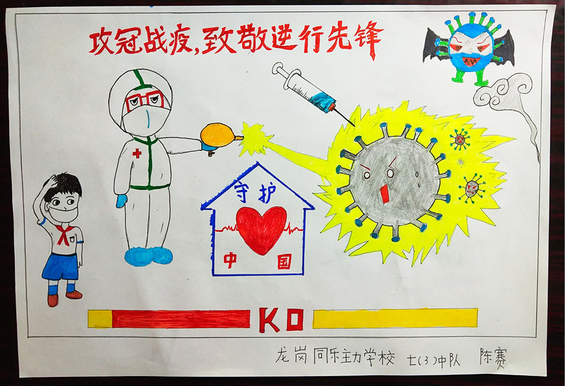 同乐主力学校二(5)中队的何锦煜、黄蓥、刘子敬通过绘画和写日记的方式加入抗疫宣传和致敬逆行先锋的队伍中。