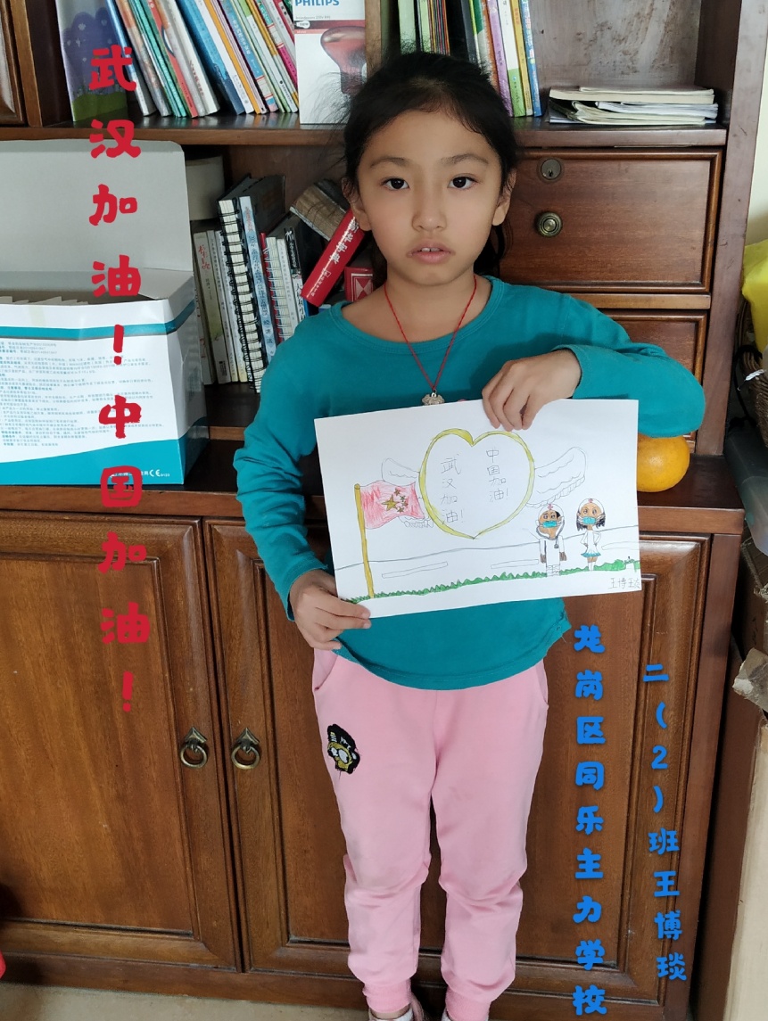 同乐主力学校二(2)班王博琰同学,积极参加 “爱心小天使”活动。该活动由深圳广电集团“第一教育”栏目组织,鼓励孩子们创作一幅作品上传“第一教育”官方,入选后即可获得一个爱心口罩,口罩署上孩子的祝福送给深圳市一线的义务人员。