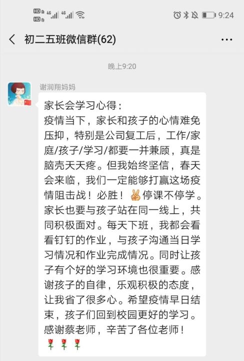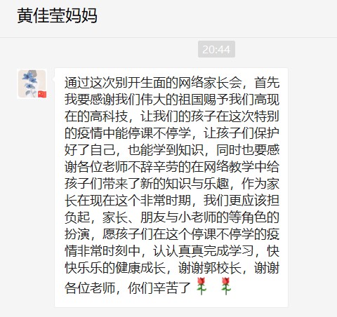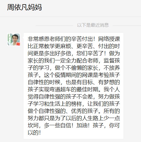 “培养孩子的自律能力,关系到孩子未来”、“居家生活是一个大考场,家长的一言一行都在为孩子的未来人生打样”等观点得到了家长们的广泛赞同,众多家长还通过班级群、微信朋友圈等发表感言,对学校的安排以及老师们的付出表示衷心地感谢,并表示一定会尽力配合学校,助力孩子们的健康成长。