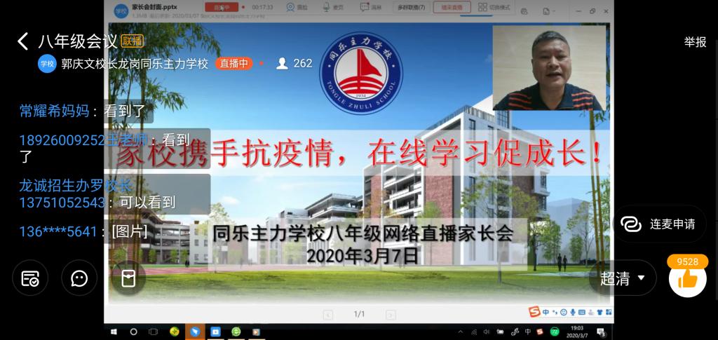 为有效做好疫情防控宣传,引导家长、学生积极面对疫情,科学规划学习生活,2020年3月7日晚上7点,同乐主力学校八年级全体师生和家长通过钉钉网络直播的形式,召开了“家校携手抗疫情,在线学习促成长!”为主题的网络家长会。