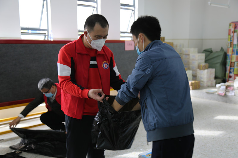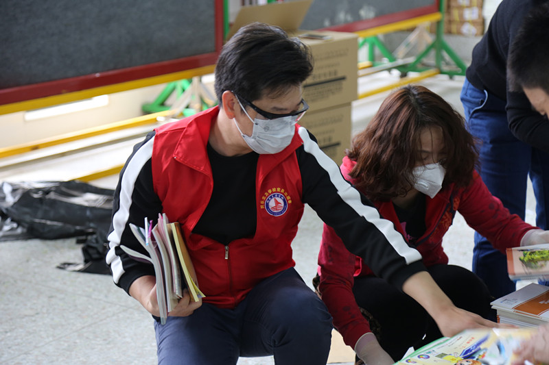 在疫情防控特殊时期,为保证新学期教材能安全及时发放给每一位学生,党员教师放弃周末休息时间,主动报名参加学校的分书打包工作。大家分工有序,流水线的操作非常高效,只用一天时间就完成了近两千份的教材打包任务,并快速送到学生手里,让学生们在家安心学习,做到“防疫”、学习两不误。