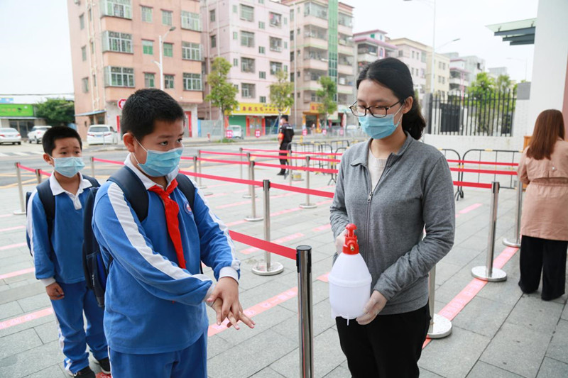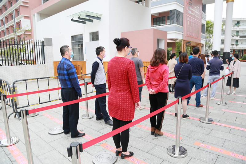 演练现场,由老师们组成的“学生”错峰上学,分别从六条通道入校,按间隔1米的要求在校门口有序排队,自觉接受体温检测并进行手部、自行车、书包等的消毒,在无异常的情况下,有序进入教室。若体温异常,将由专人带至隔离区进行复测,并由校医再次用水银温度计对学生体温进行检测,同时将此生经过的通道进行消毒并封闭。