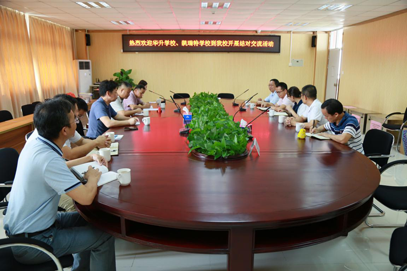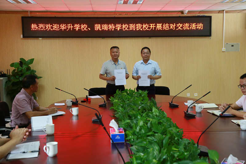 首先,郭庆文校长致欢迎辞。郭校长对华升学校张德良校长与凯瑞特学校董国明校长、梁小庆副校长的到来表示欢迎。然后在大家的见证下,我校分别与华升学校张校长、凯瑞特学校董校长签订了帮扶协议书。