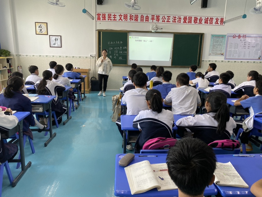 刘梦妹老师为802班的学生带来了文言文的一课——《记承天寺夜游》。刘老师的课堂教学过程清晰、循序渐进、设计完整。她根据文言文的教学方法,从理解重点词语、句子,到感受苏轼内心复杂的情感,老师的引导是非常出色的。