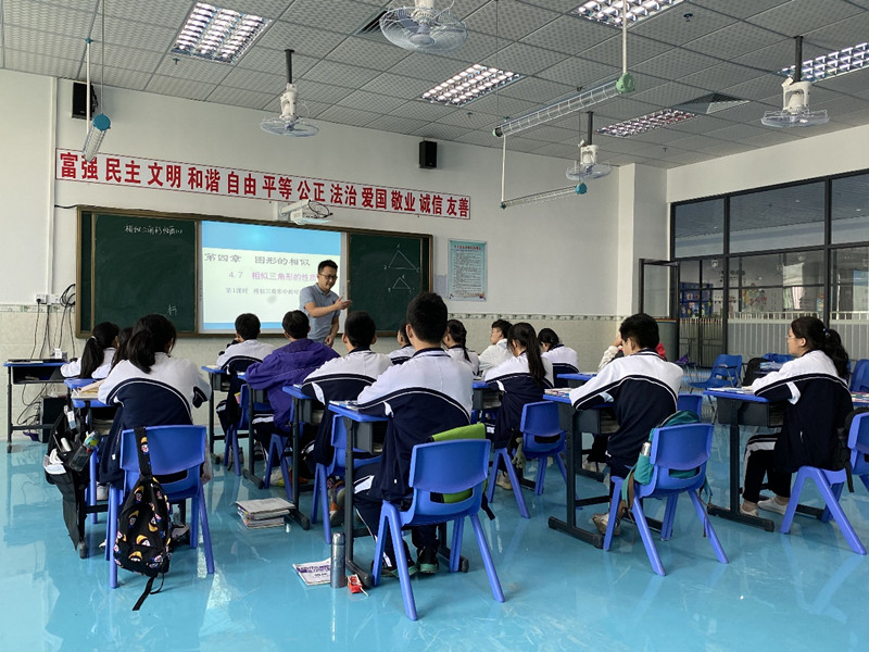柯于胜老师为902班的学生带来一堂《相似三角形性质—对应线段之比》的探究课。柯老师带着学生从相似三角形判定的回顾开始,让学生叙述,并把叙述的文字转化为数学语言。以例题为主体,以图形为载体,带领学生梳理相似三角形对应边、对应角的关系。抓住“相似比”的基础概念,引发学生思考相似比是谁与谁的比,那么反过来的比值又可以如何表示,强调相似比的顺序性。带领学生梳理证明相似的思路,让学生上台板书,教师予以指导与评价,以此形式探究相似三角形对应高线、对应中线、对应角平分线的相似比。整个课堂学生参与度高,表现积极,是一堂精彩的高效课堂。