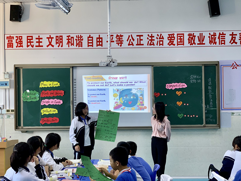 杨文丽老师为七(2)班的同学们送去了一节精彩的英语阅读课《The Earth》。在课堂上杨老师采用了小组合作的学习形式,课堂氛围十分活跃。她首先让每个小组根据自己的小组颜色朗读课文,充分调动了学生的积极性,把读的环节落到实处;其次让每个小组通过分工合作完成一张关于保护地球的海报,老师进行引导和启发,让每个学生都参与到了课堂中;最后每个小组代表上台展示自己的作品,老师和同学们一起评出最佳作品,整个课堂充分体现了以教师为主导,学生为主体的新课程教学理念。