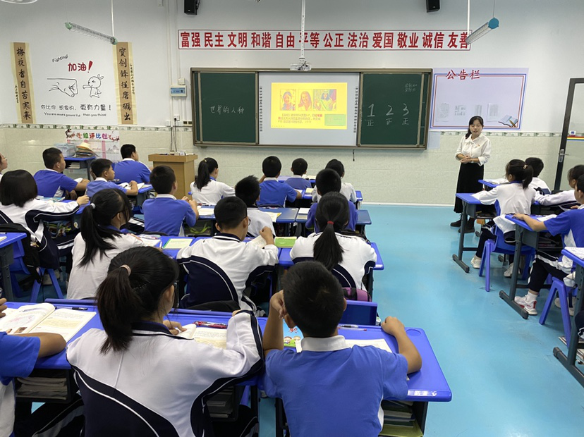 靳丽康老师为七(2)班的同学们带来了一节有趣的地理课《世界的人种》。靳老师采用组内合作、组间竞赛的互动学习形式,充分调动了学生的积极性,发挥了学生的课堂主体作用,培养了学生的地理学科核心素养。本节课从“地理杯”选美比赛开始,分为三个环节,第一环节为“我来当评委”,小评委们纷纷举手说答案,准确认识三大人种的体质特征;第二环节为“美人何处归”,靳老师邀请同学上台在地图上指出三大人种的主要分布地区;第三环节为“放下心中的偏见”,通过网上的帖子引导同学们放下心中的偏见,从科学的角度认识不同人种的体质特征,树立科学的种族观。最后,学生以闯关的形式完成本节课的练习,在愉快的讨论中结束本节课。