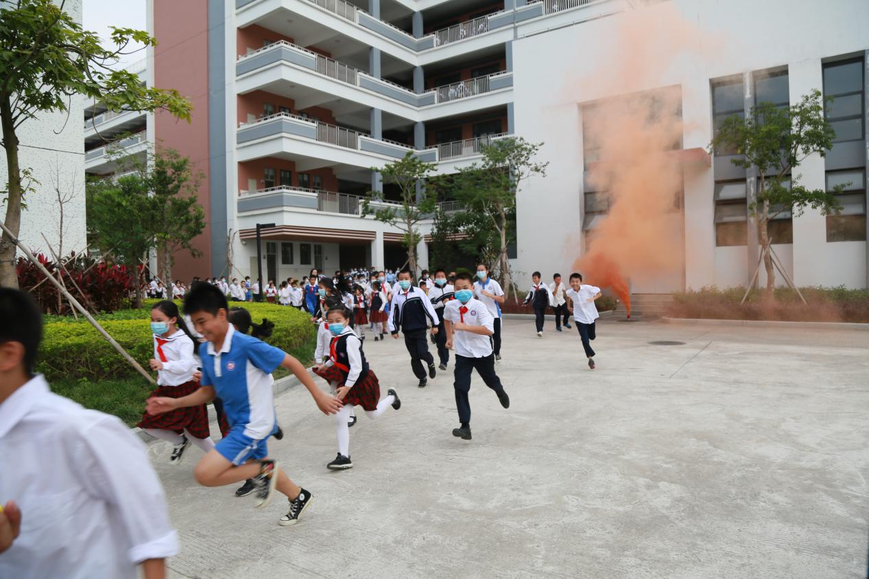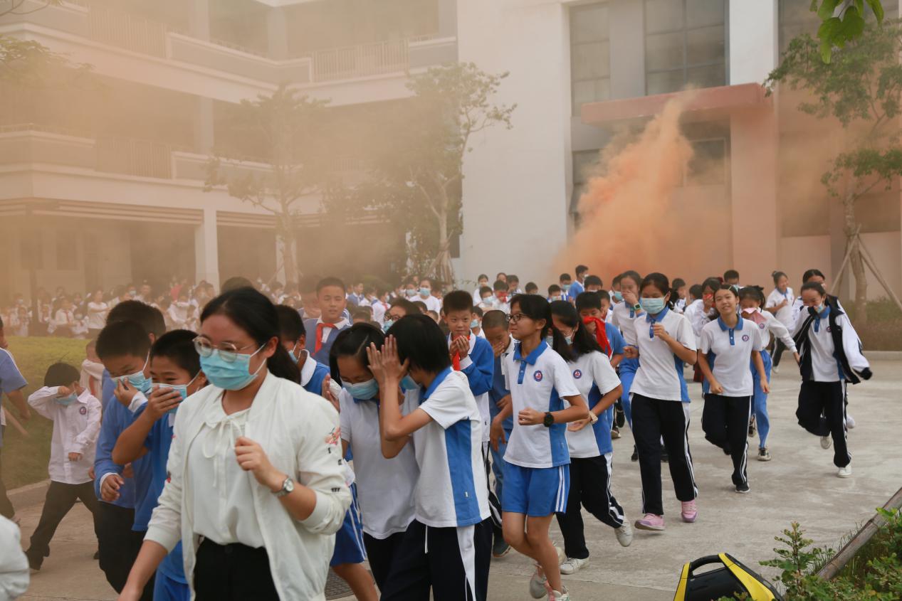 校园里响起火警铃声后,同学们在老师的组织下迅速有序地从教室撤离到校园空旷处。集合、整队、清点人数并上报,一切都井井有条。