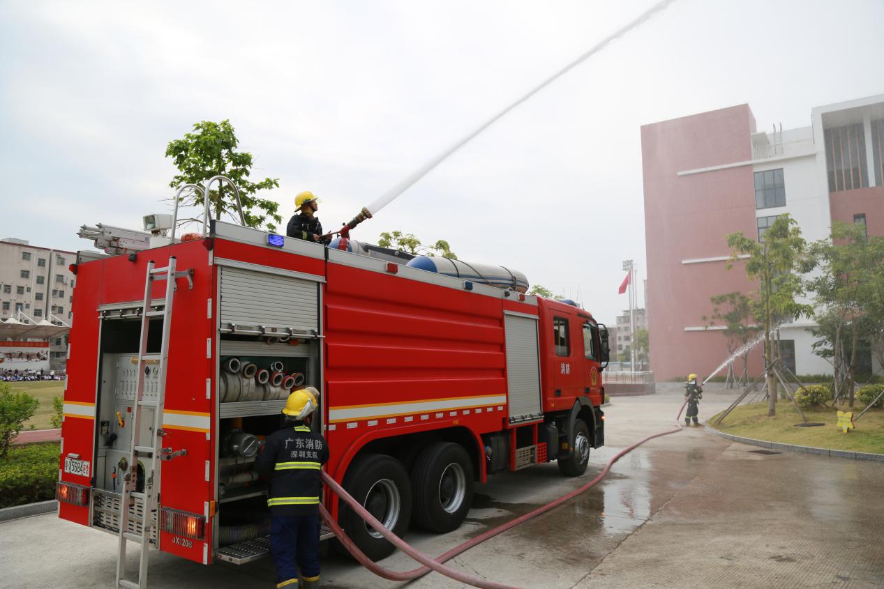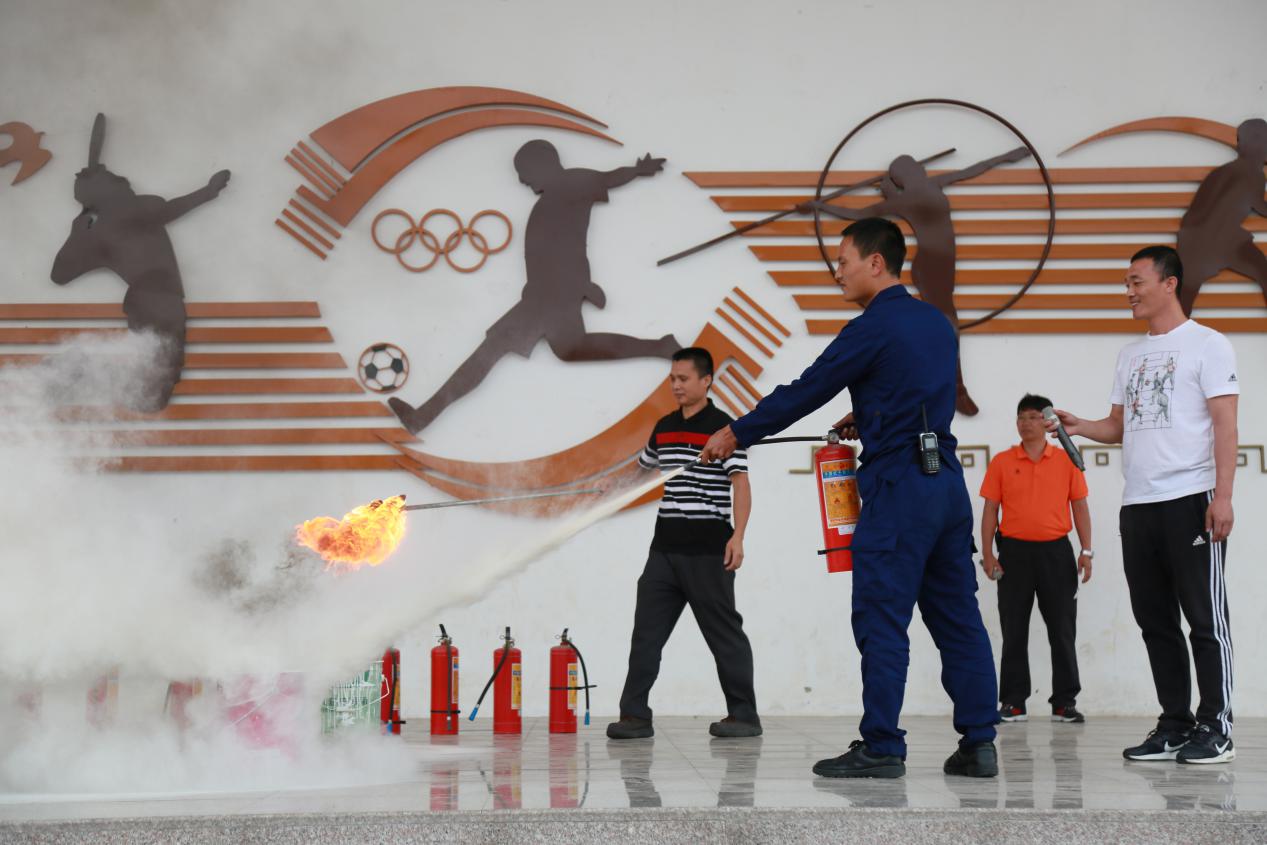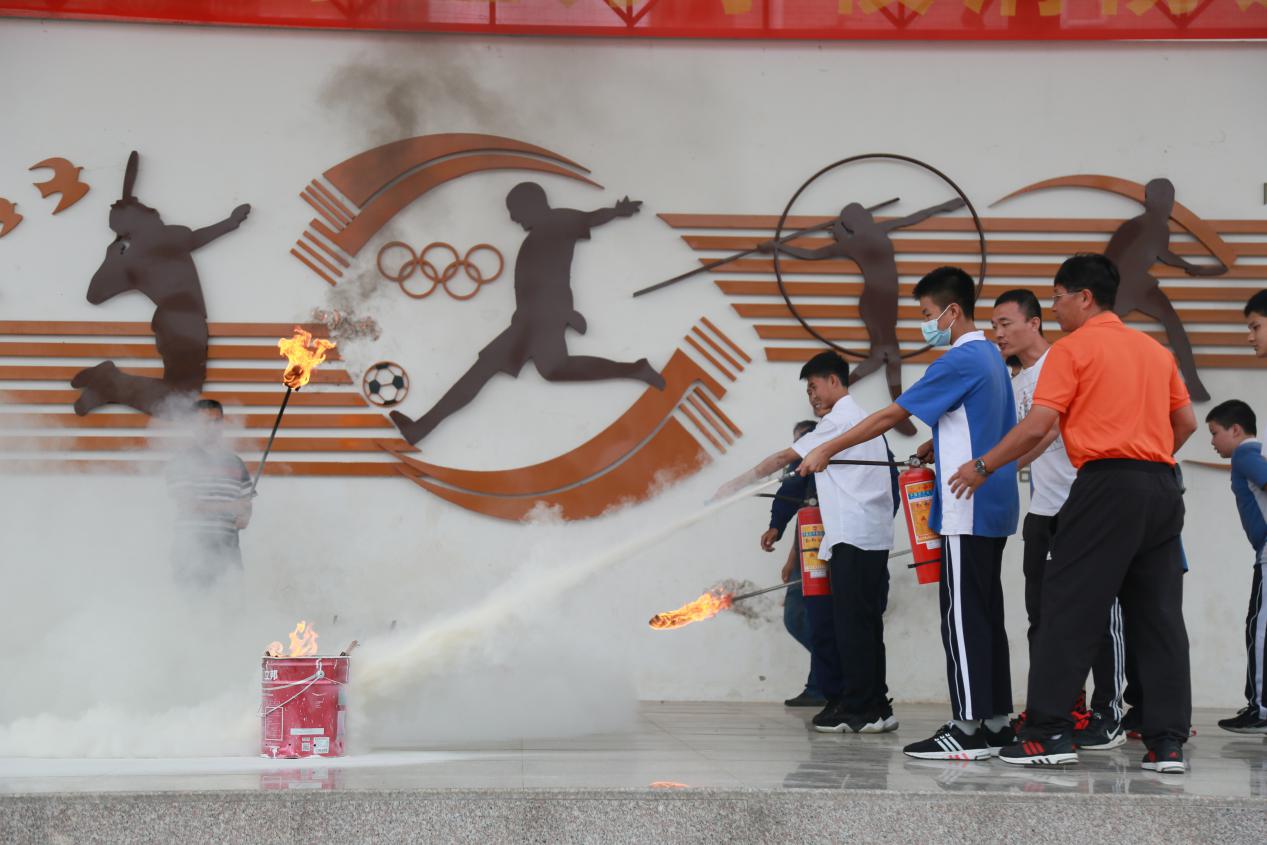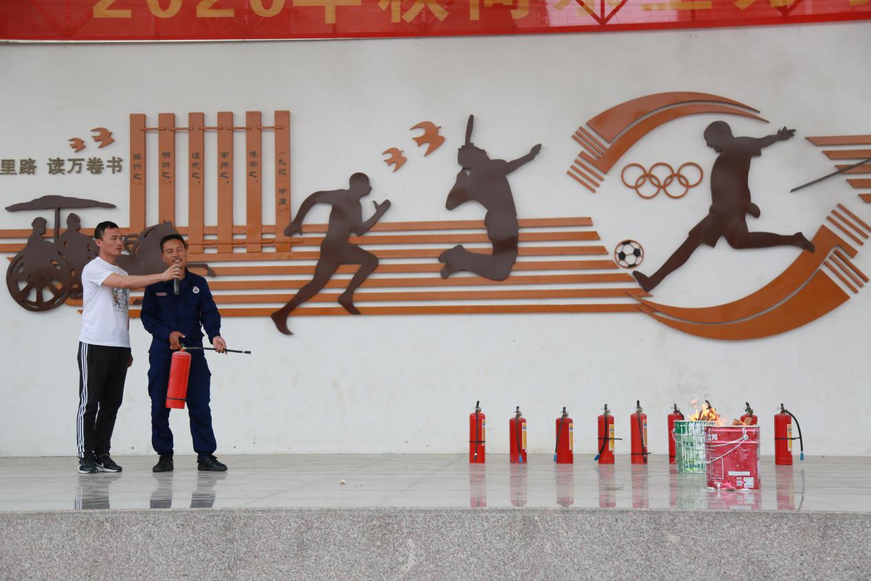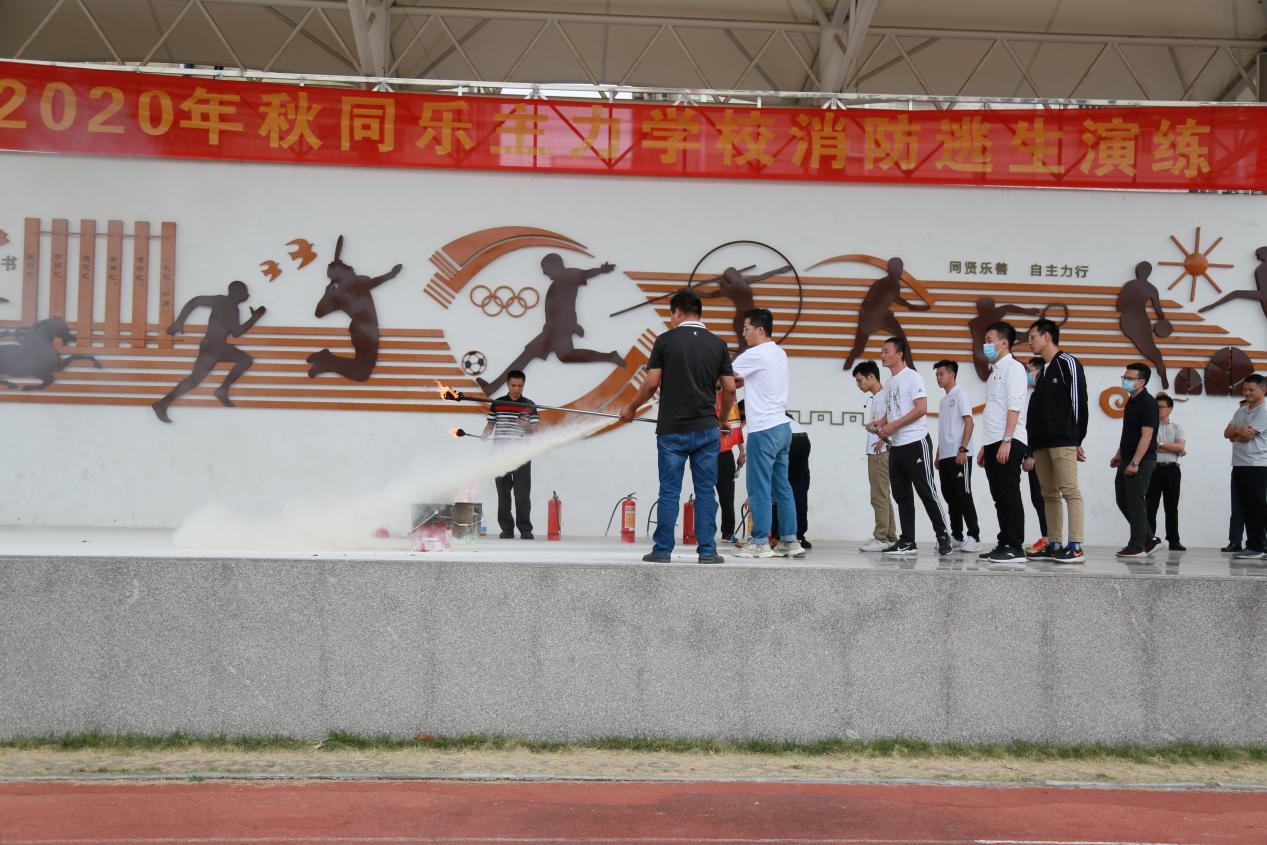龙东消防救援队成员向同学们示范如何使用灭火器。学生代表及教职工也上台学习使用灭火器。