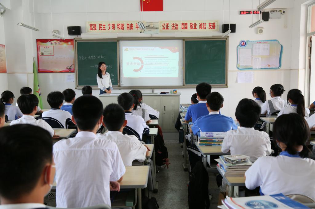 党员教师们采用宣讲,看视频等形式,从“没有共产党就没有新中国”和“没有共产党就没有社会主义中国”两个方面共同学习。让学生了解中国共产党的发展历史,中国共产党为改变当时半殖民地半封建社会中华民族悲惨的命运,在新民主主义革命时期完成救国大业,宣告中国人民从此站立起来。在社会主义革命和建设时期完成兴国大业,抗美援朝战争打出了新中国的国威,新中国从此站稳了脚跟。共产党带领中国人民推动现代化建设,自行研制的第一颗原子弹、氢弹爆炸成功,第一颗人造卫星发射成功,生产出第一架汽车、建造出第一座大桥……中国历史上的无数个第一让中国的国际地位迅速提升,成为有重要影响的大国,提高了中国人民的民族自信心和民族自豪感。