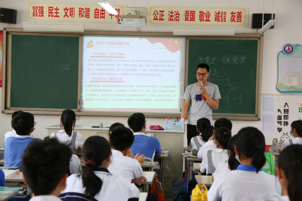 2021年是中国共产党成立100周年,是实施“十四五”规划,开启全面建设社会主义现代化国家新征程的起步之年。为深入学习贯彻习近平新时代中国特色社会主义思想,教育引导广大青少年听党话、感党恩、跟党走,培育担当民族复兴大任的时代新人,2021年3月29日下午,同乐主力学校党员教师党史宣讲团在初中部开展"学党史、知党恩、跟党走"主题教育活动。