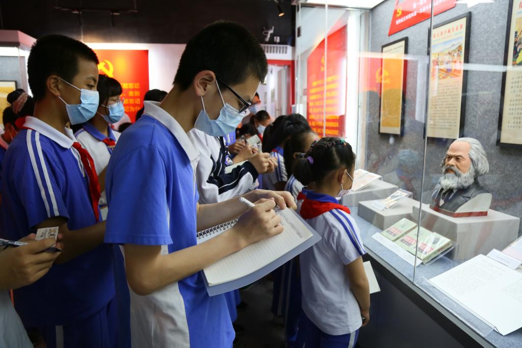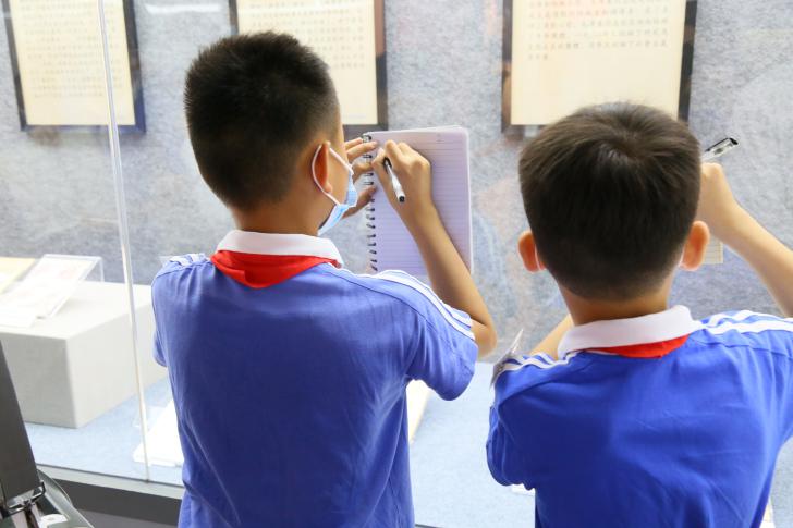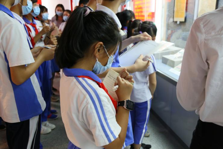 在自由观看的时间里,少先队员和共青团员们不时驻足凝神,不时低头记录。