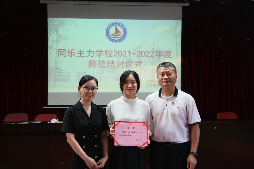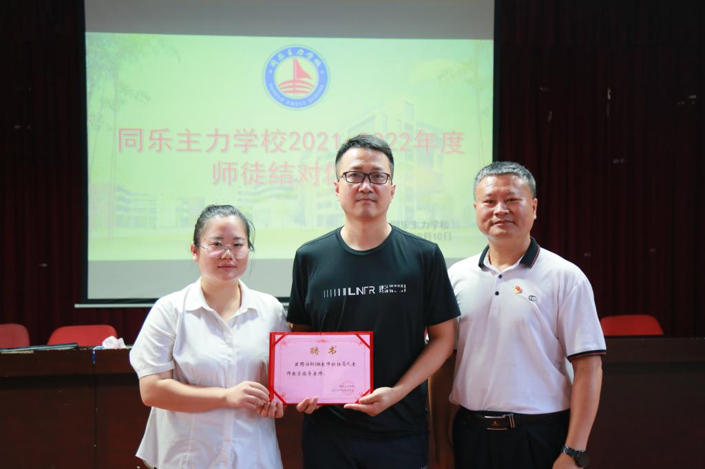 党支部书记、校长郭庆文同志为师父颁发证书并与师徒合影留念。