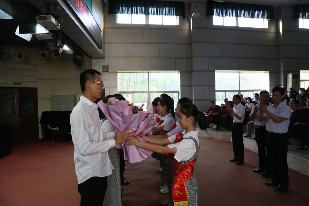 邓桃老师宣布我校表彰名单:南粤优秀教师、龙岗区先进教育工作者、龙岗区优秀班主任、龙岗区优秀教师及我校感动校园教职工名单,由校礼仪队献花。郭庆文校长、蓝天胜副校长、李建新副书记与我校优秀教师合影留念。