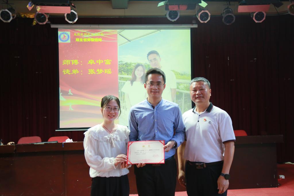 党支部书记、校长郭庆文同志为班主任师父颁发证书并与师徒合影留念。