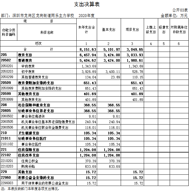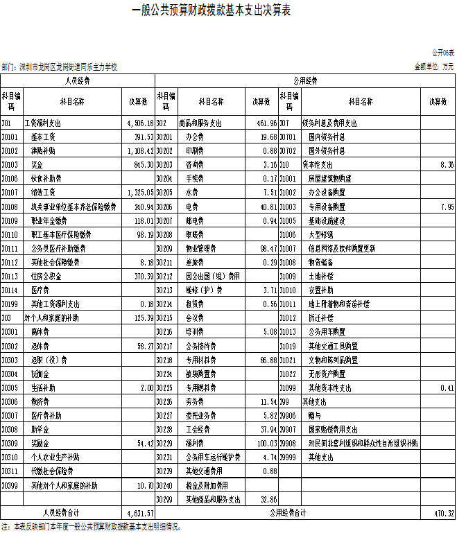 深圳市龙岗区龙岗街道同乐主力学校2020年度部门决算