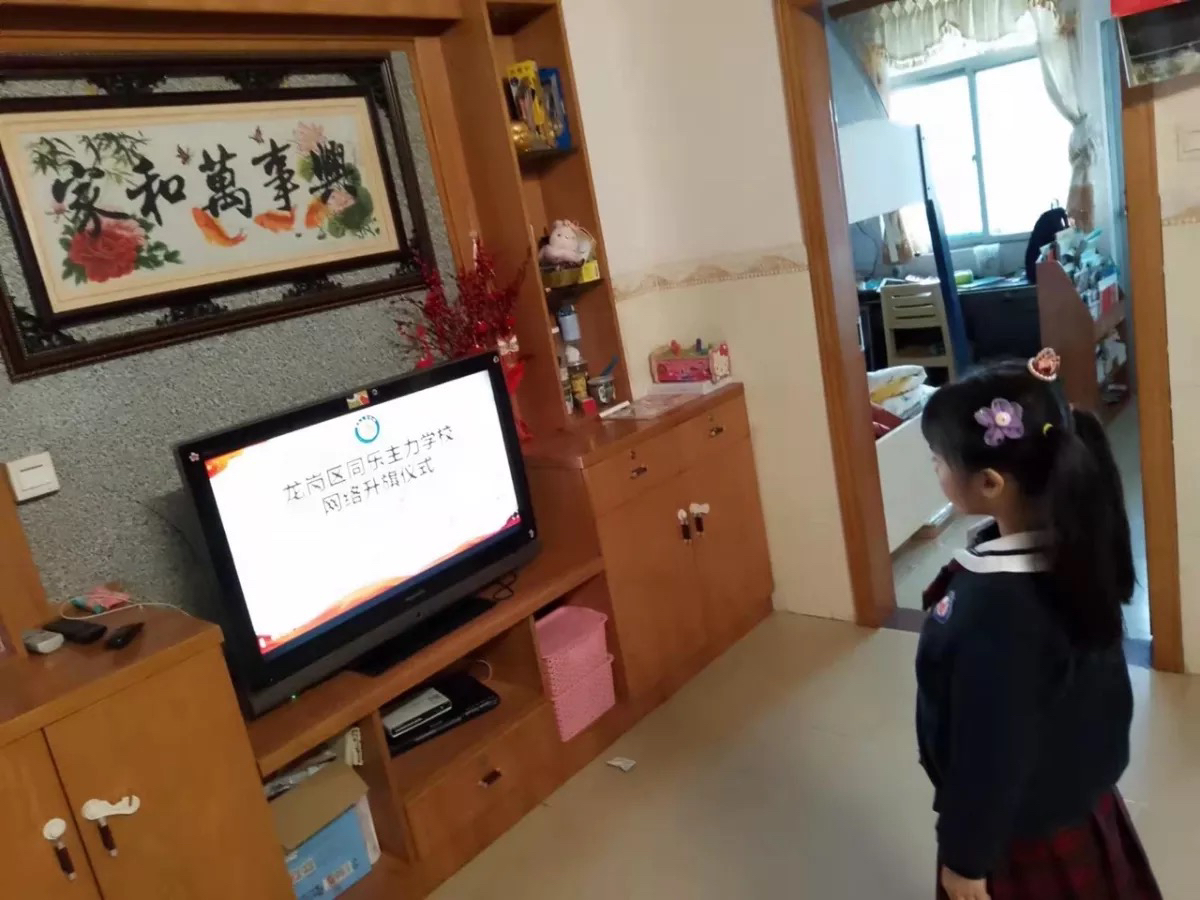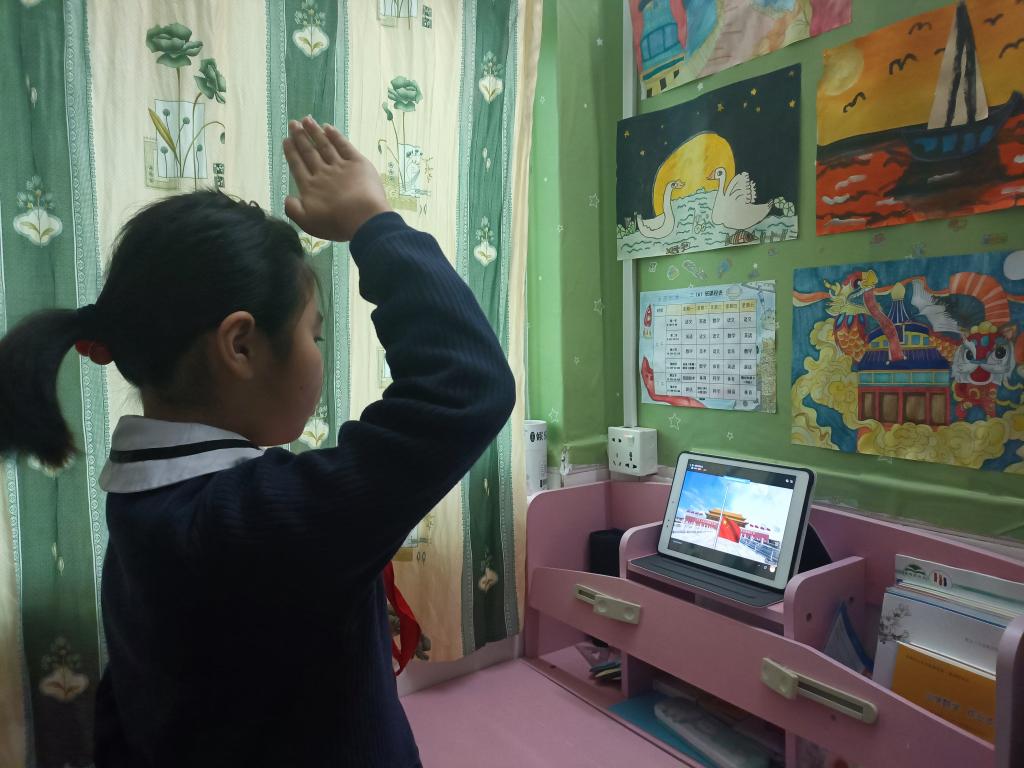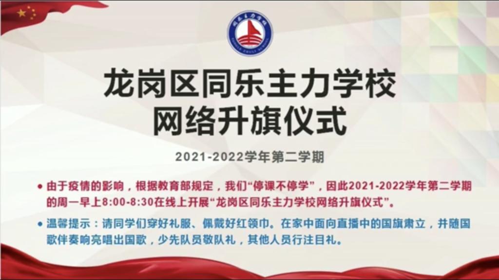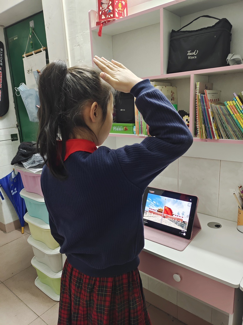 随着嘹亮的国歌声响起,2月21日上午8点,龙岗区同乐主力学校全体师生在家中举行了线上升旗仪式。少先队员们穿上干净整洁的礼服,佩戴好红领巾,面向国旗庄严肃立,敬队礼。别看这是一次“云端”升旗,可仪式感和肃穆感丝毫不减。
