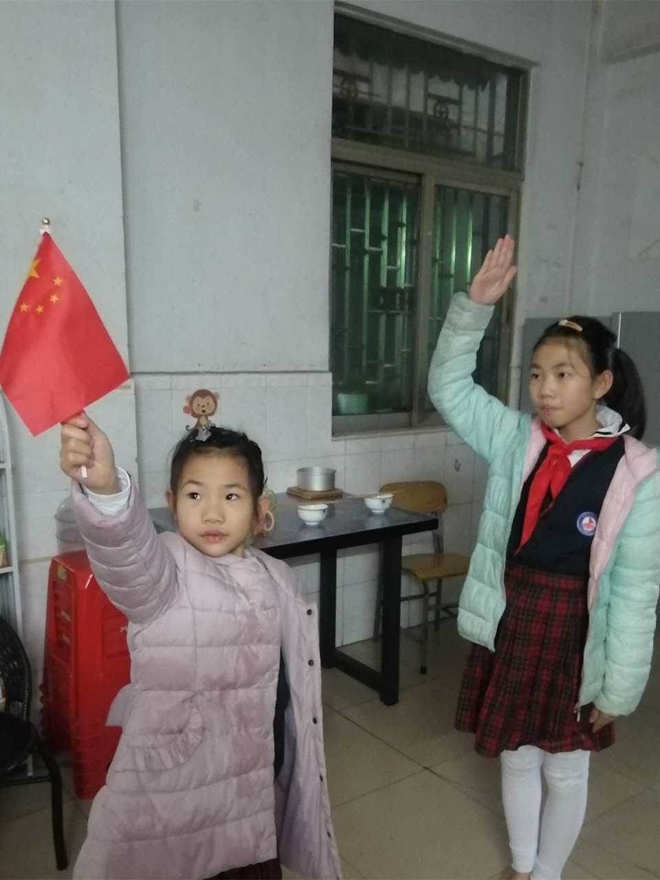 少先队员们高高举起了右手向国旗敬队礼,鲜艳的红领巾流露出孩子们饱满的爱国热忱,高高举过头顶的小手彰显出孩子们战胜疫情的坚定信念!