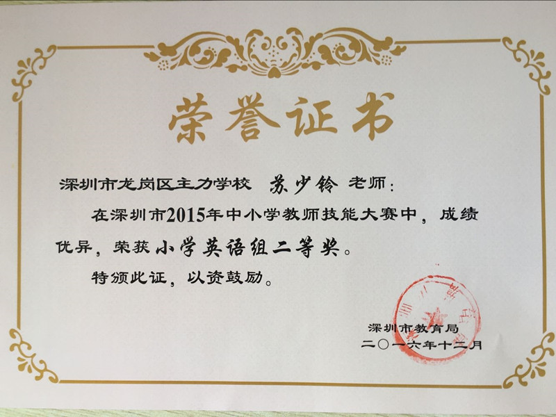 苏少铃老师在深圳市2015年中小学教师技能大赛中,荣获小学英语组二等奖